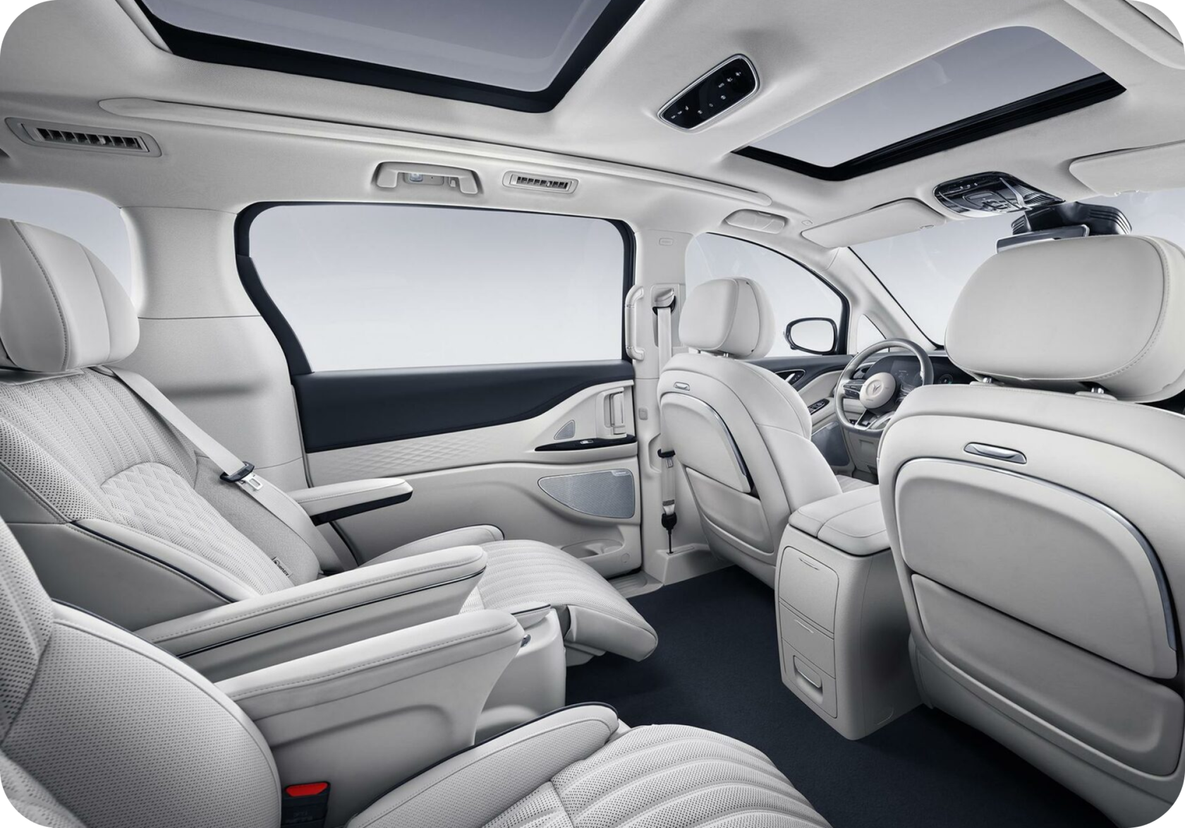 Центральная консоль состоит из двух дисплеев. Один экран предназначен для водителя, а второй для пассажира. Для создания в салоне особой атмосферы предусматривается светодиодная подсветка (256 цветов). Комфорт и приятное впечатление о поездке обеспечит панорамная крыша, раздельный климат контроль, эргономичные сидения с функцией подогрева, массажа и вентиляции. Кресла второго ряда могут наклоняться на 40°. Для максимального уровня удобства пассажиров заднего ряда предусматривается подставка для ног с электрическим приводом и широкий подлокотник с подстаканниками. Звуковая система, мощностью 1920 Вт, состоит из 21 динамика. Для отделки внутреннего пространства используется кожа Nappa.